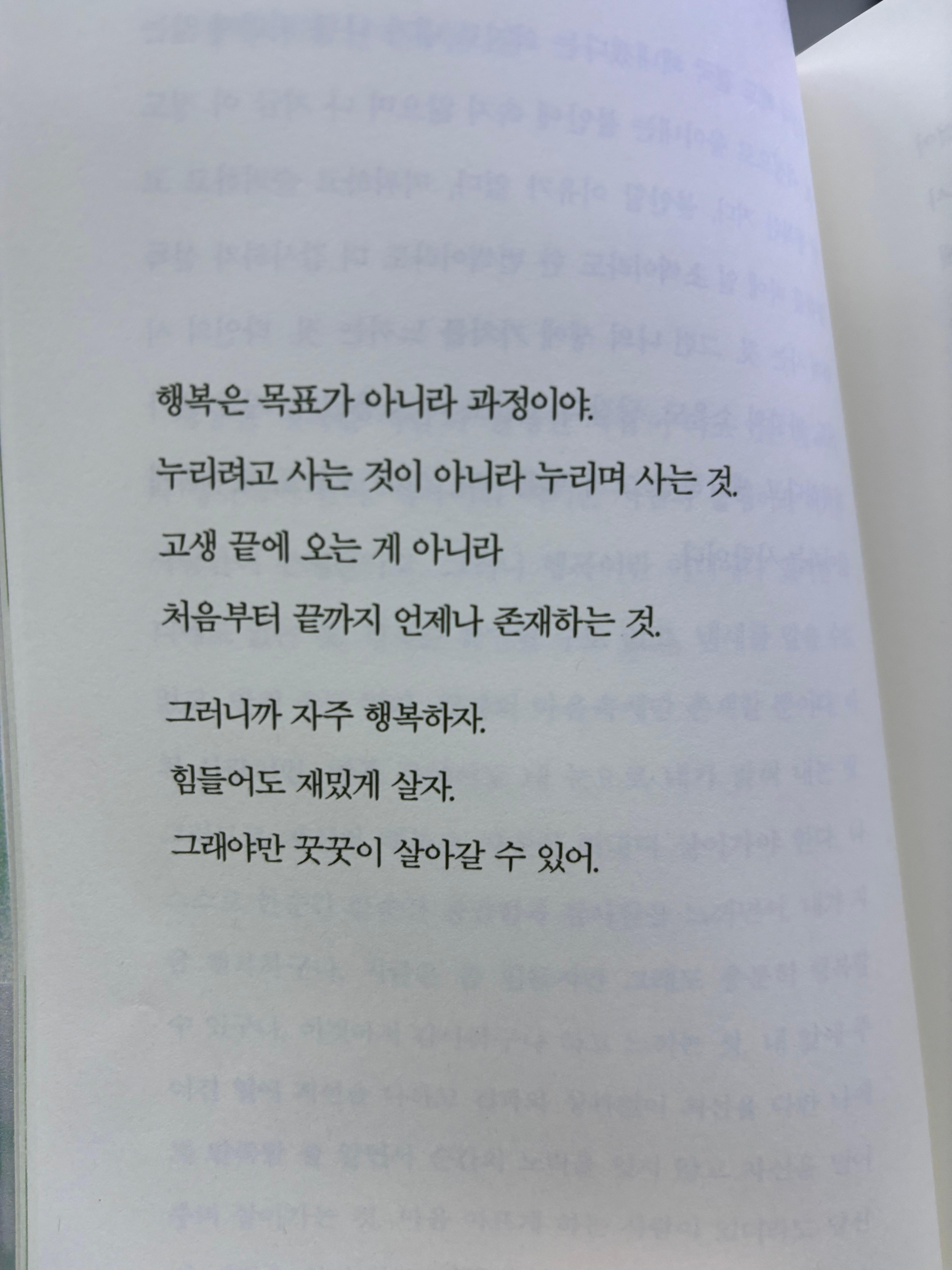 책을 읽을수록 깨닫는 것들이 많아진다. 불행할 이유를 찾지 않으면 행복할 이유만 남는다는 것. 나만의 속도로 나아가는 것도 충분히 빛나는 일이라는 것. 불행은 곳곳에 도사리고 있지만, 결국 행복은 불행을 이길 수밖에 없다는 것.