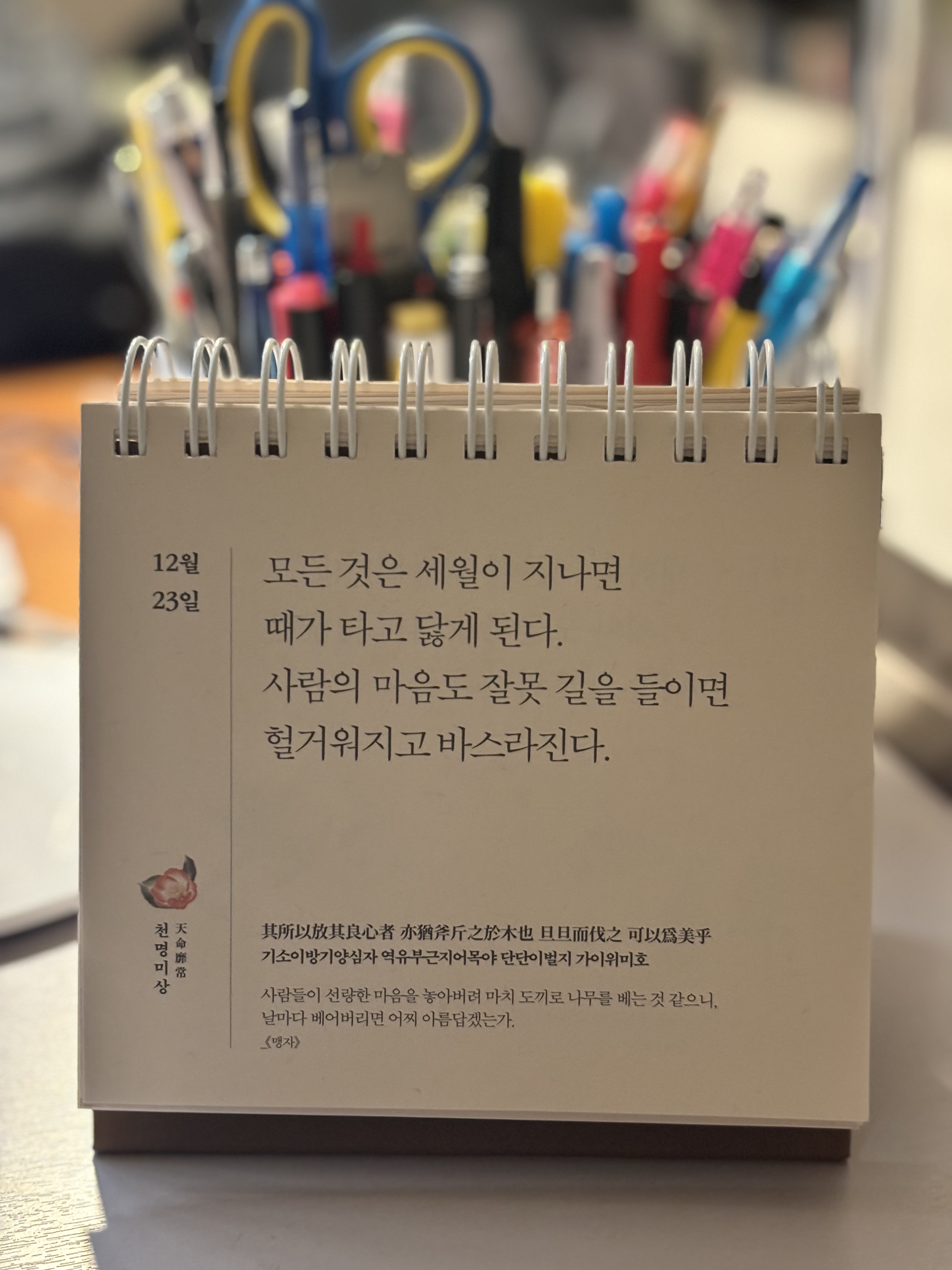 "저는 최근에 처음 글을 제대로 쓰기 시작했습니다." 모두가 나를 쳐다봤다. 이미 말을 시작했으니 계속 이어나갔다. "47살인데, 이제 시작했어요. 매일 5분씩 씁니다. 서툴고, 부족하지만요." 잠깐의 침묵이 흘렀다. 순간 '내가 왜 이런 말을 했을까' 싶어 후회가 밀려왔다. 그런데 한 분이 환하게 웃으며 말했다. "와, 솔직하시네요. 보통은 다들 부풀리는데."