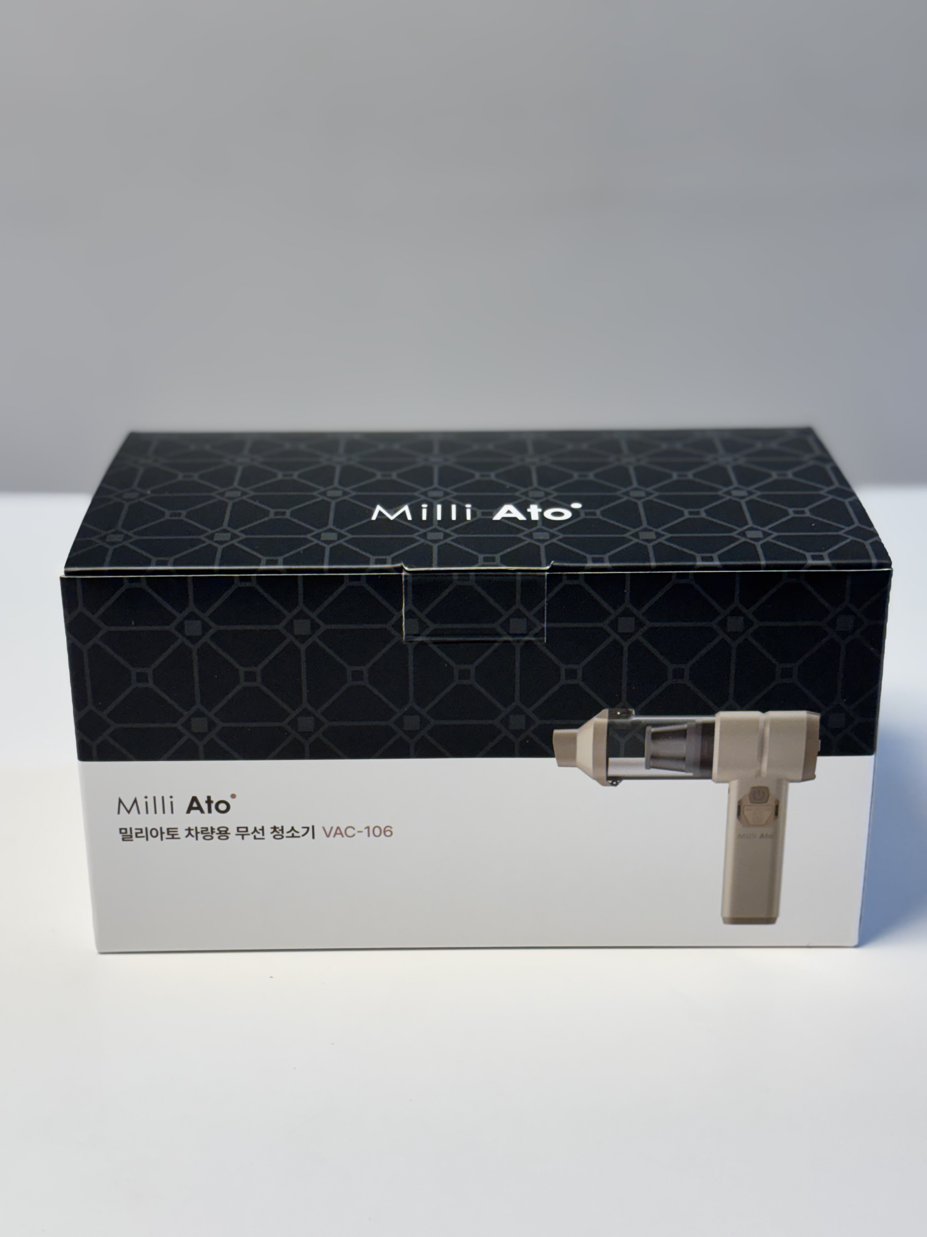 밀리아토 차량용 무선 청소기(VAC-106)를 처음 받았을 때, 그 가벼움에 놀랐다. 한 손에 쏙 들어오는 크기. 베이지색 본체는 세련되면서도 따뜻한 느낌이었고, 검은색 기하학 패턴의 패키지는 마치 작은 선물 상자 같았다. 제품을 열면서 드는 생각은 '이 정도면 정말 부담 없겠구나'였다.