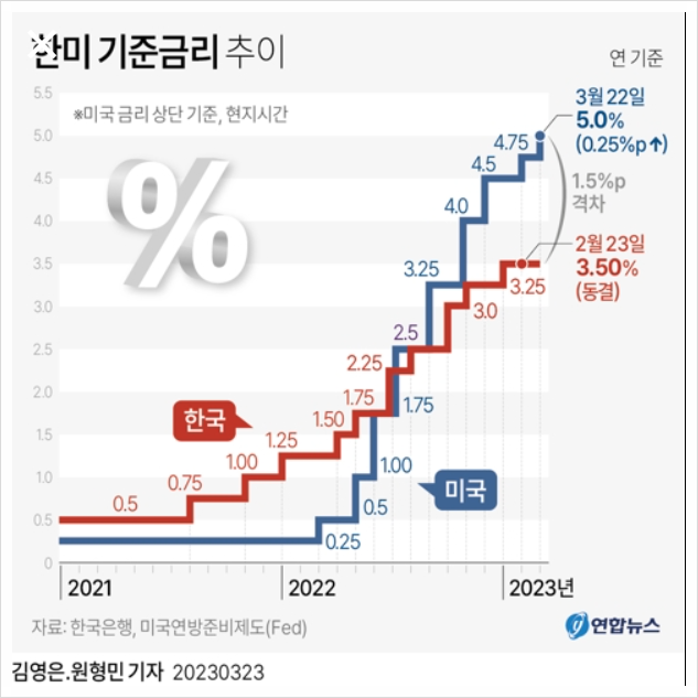 이번 금리 동결로 미국과의 기준금리 차이가 1.5%가 되었고 만약 미국이 5월 한번 더 인상을 하면 차이가 1.75% 벌어져 역대 최대폭이 됩니다. 그렇게 되면 한국은 외국인 자금유출을 걱정해야 하고 원화절하의 압력이 지속 있을 수 있습니다. 그렇지만 현재 엄청난 가계부채 때문에 금리 인상을 할 수 없으니 외부 내부 모두 어려운 상황임은 분명 합니다.