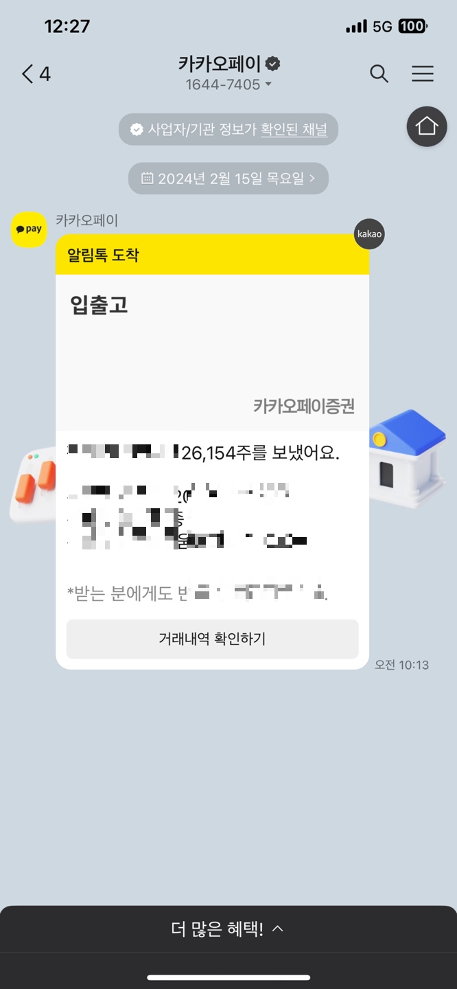 7. 국내 주식은 바로 입급 확인 가능 하며 아래와 같은 카카오톡이 온다