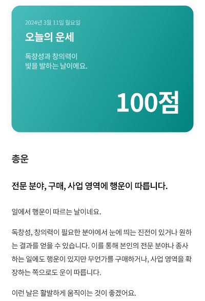 오늘의 운세는 당일의 점수 100점 이라고 한다.