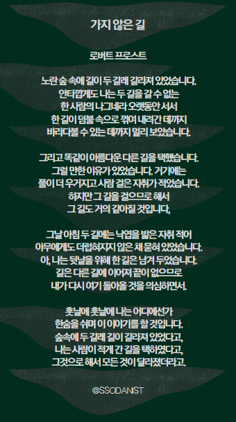 요즘은 로버트 프로스트(Robert Frost)의 시 "가지 않은 길" (The Road Not Take)의 내용처럼