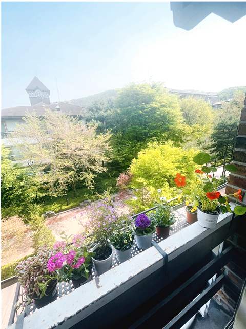 창가에 놓아두었는데 밖으로 보이는 푸르름과