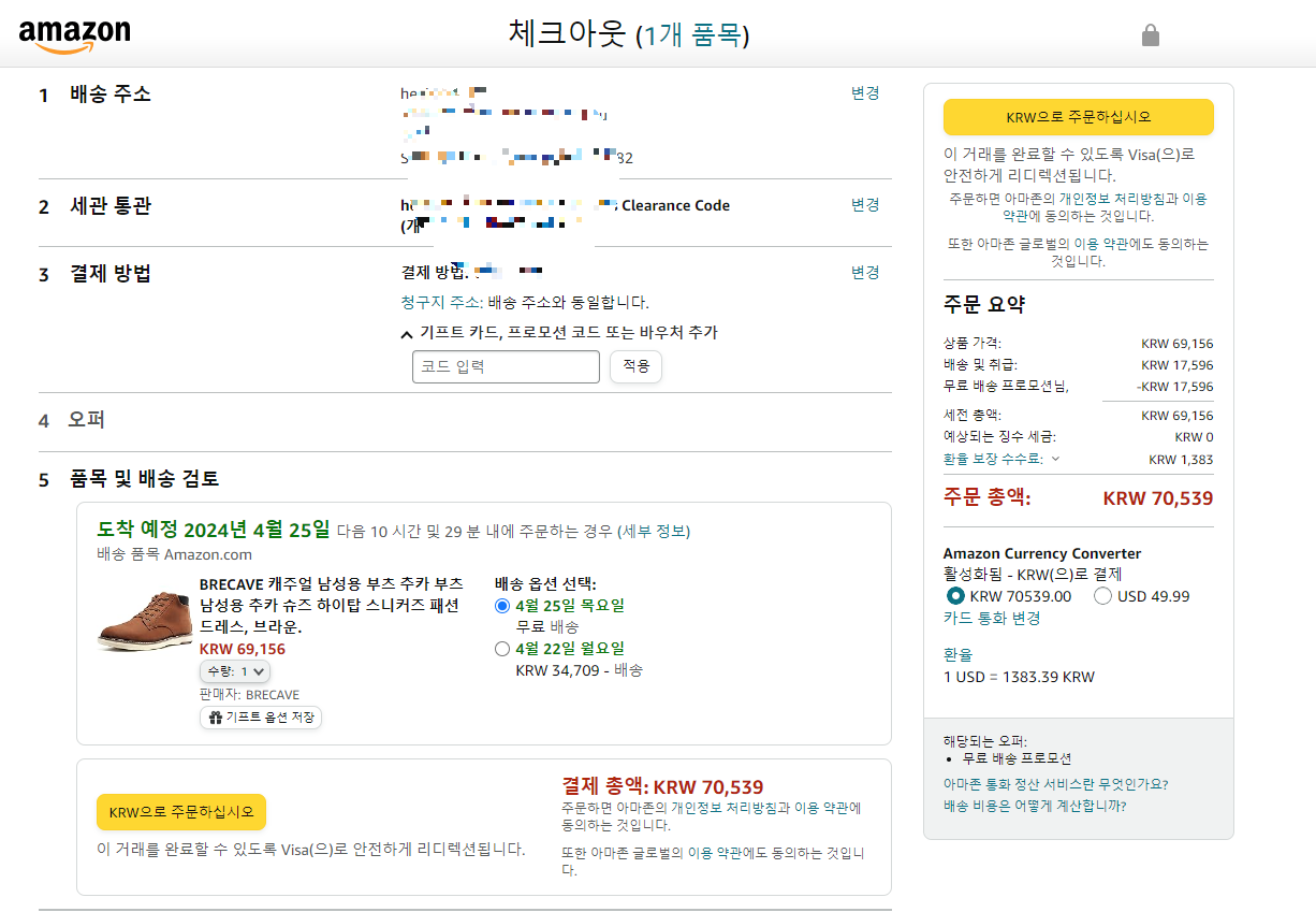 - 아마존에 들어가서 정책에 부합하는 상품을 하나 골라 결제 프로세스를 진행했는데 아래 그림 처럼 무료배송이 실제로 진행 되었다.