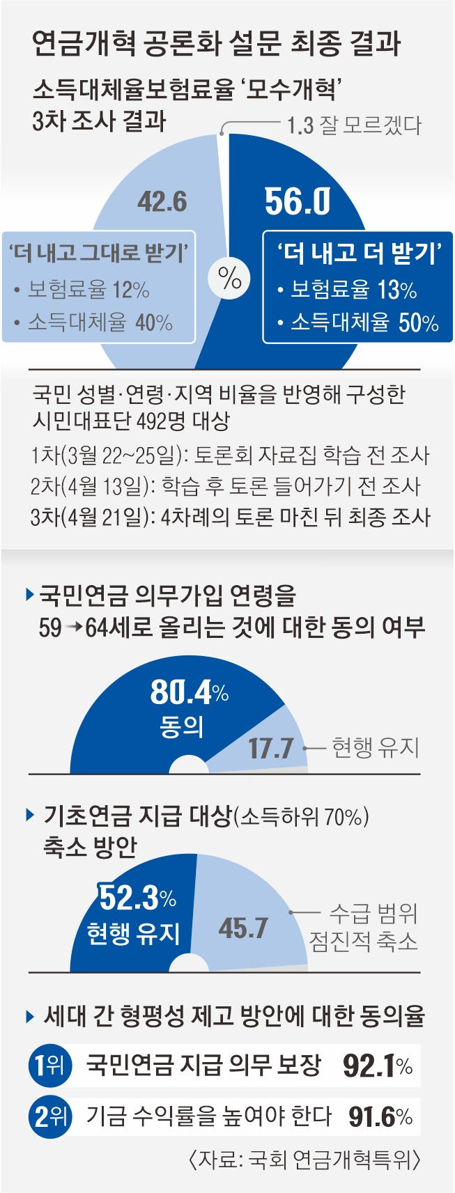또한, 20대 절반 이상이 이러한 개혁안에 찬성하는 것으로 나타나, 정작 미래 세대의 부담이 커질 수 있는 방안임에도 불구하고, 당사자인 20대가 이를 받아들일 의사가 있는 것으로 보도되고 있는데 난 사실인지는 잘 모르겠다. 이러한 개혁안은 국민연금의 재정 안정성을 확보하고, 노후 소득 보장을 강화하기 위한 목적으로 제시되었다. 국회 연금개혁특별위원회는 시민 의견을 바탕으로 최종 개혁안을 마련할 계획이며, 21대 국회 임기 중 처리 가능성에 대한 논의가 진행 중이다.
