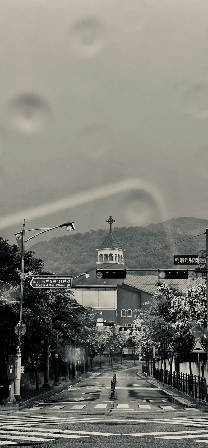 사람도 차도 없는 비 오는 도로와 거리 중간의