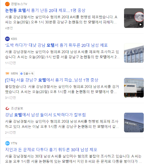 논현동 모텔서 흉기 난동 20대 체포…1명 중상 (daum.net)