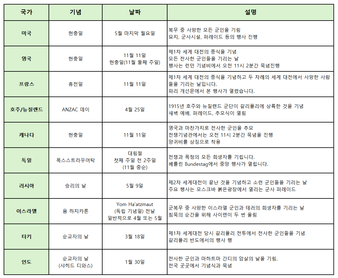 4. 다른 나라의 전몰장병 기념일