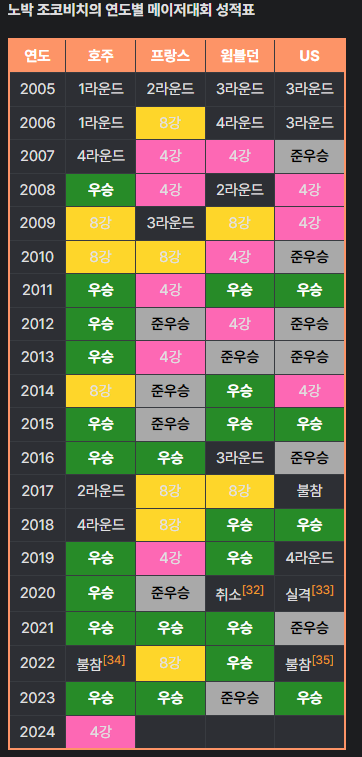조코비치는 2008년에 첫 그랜드 슬램 우승을 차지했으며, 호주 오픈에서 특히 강세를 보이며 2024년 기준 10번의 우승을 차지했다.