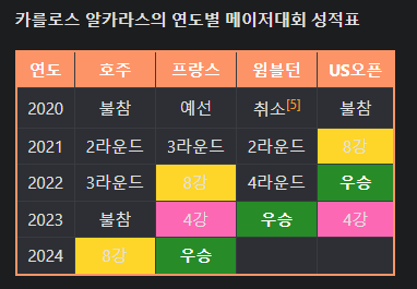 이번 24년 프랑스 오픈을 오승 했고 지난해 US오픈 우승에 이어 두 번째 메이저 대회 정상에 등극했다. 올해 프랑스오픈 준결승에서 알카라스는 조코비치에게 패해 결승 진출에 실패했다. 이번 윔블던 결승에서 설욕에 성공한 알카라스는 세계 랭킹 1위를 지켰습니다.