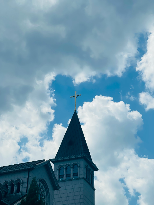 집으로 돌아오는 길 집 근처 성당의 첨탑이 푸른 하늘 구름과