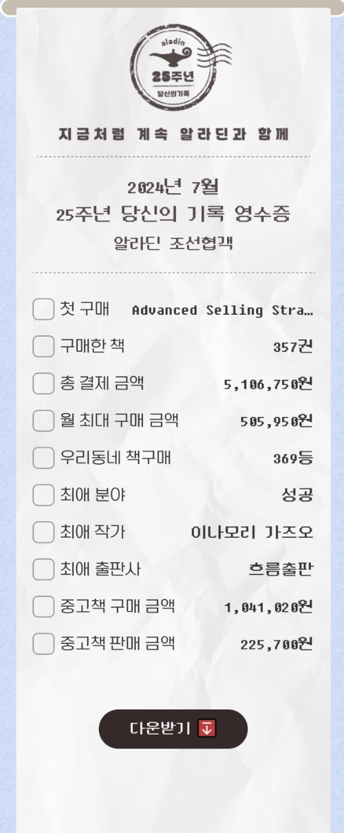 알라딘에서는 25주년 나의 기록을 만들어 보내왔다.