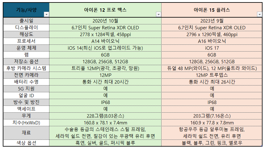 가장 심한것은 배터리의 소진 속도였고 조금씩 버벅거리기도 하고 기능이 이전만 못했다. 이로 인해 기종변경을 고민하던중 새롭게 출시된 아이폰 15 플러스를 사용해보기로 결심했다. 이 글에서는 아이폰 12 프로 맥스와 아이폰 15 플러스를 사용하며 느꼈던 변화를 상세히 공유해볼까 한다. 여러분도 이 글을 통해 어떤 변화가 있었는지, 그리고 혹시라도 아이폰 15 플러스로의 전환을 고려하고 계신다면 도움이 되길바란다.