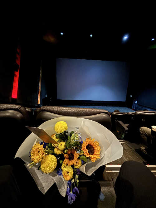 백팩을 둘러메고 꽃다발을 들고 혼자 영화 보는 사람이 많지는 않은 것 같다.