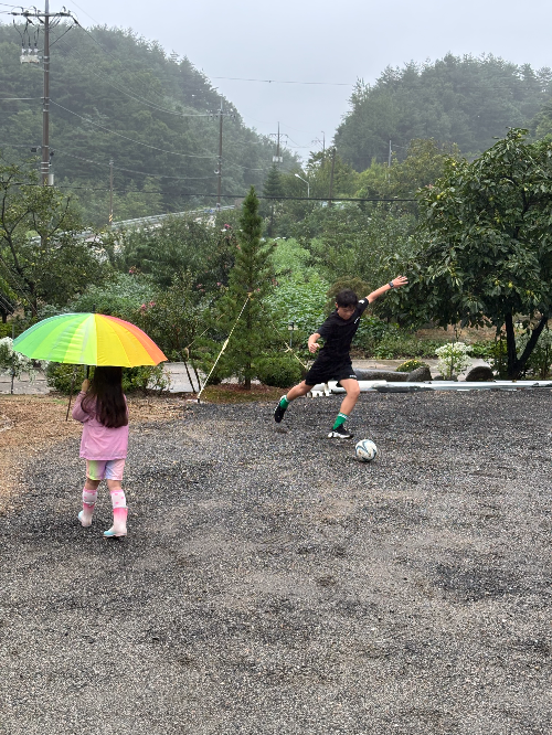 혼자 뭐라고 중얼거리며 연신 공을 찬다.