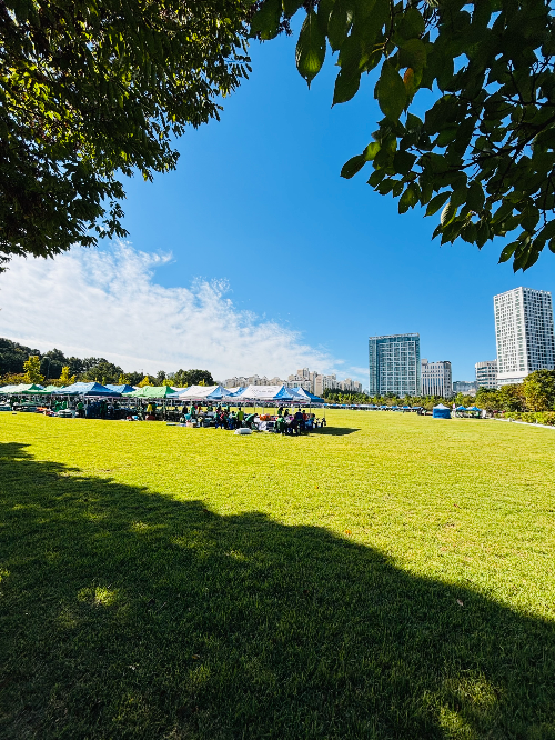 구청 잔디마당 한가득 그늘막이 쳐 저 있고