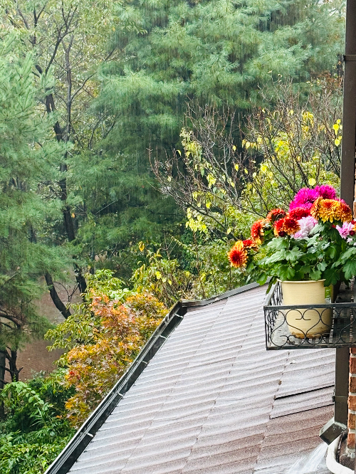 비 오는 풍경 아래로 한 달 전 심어놓은 국화화분이