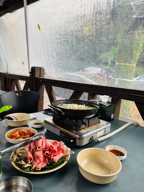도착하자마자 받아온 재료로 배춧국을 끓이고