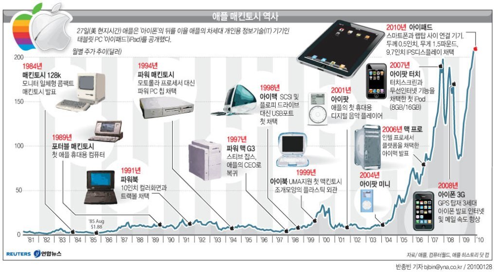 특히나 애플은 오일쇼크가 한창이던 시기 탄생하여 전세계 개인 PC 시장을 열었습니다. 또한 닷컴버블때 아이팟을 출시해서 MP3시장을 재구성 하였으며 서브프라임 직전인 2007년 아이폰을 출시 전 세계를 혁신 하였습니다. 이 40년의 역사를 가진 회사는 경제위기마다 혁신을 만들어내어 지금의 왕좌를 건설 해왔습니다.