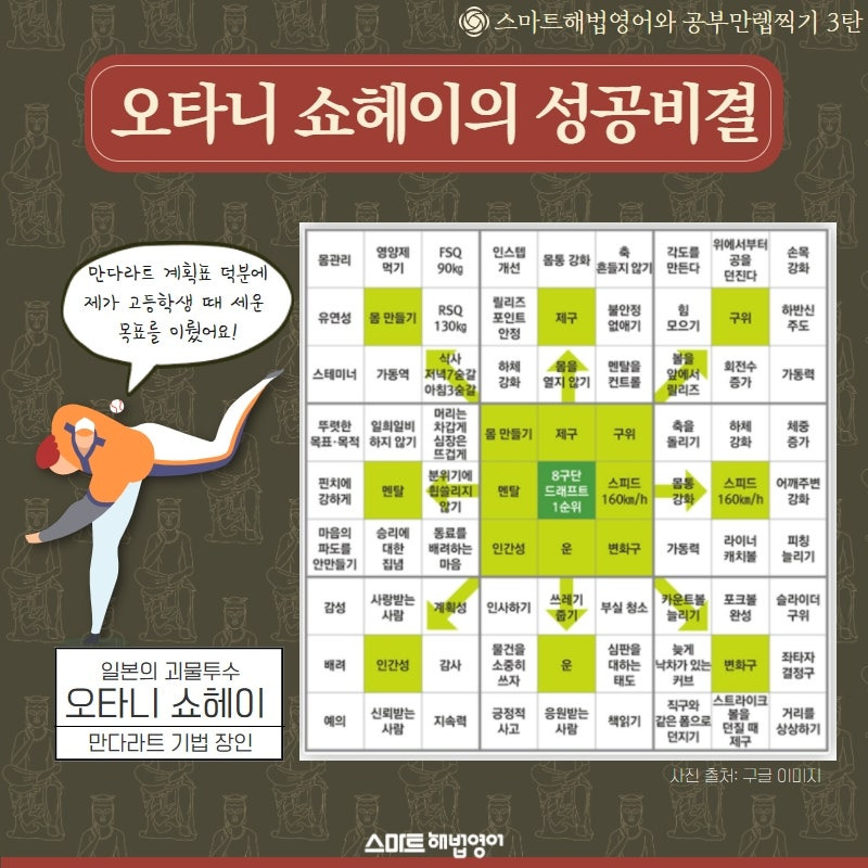 오타니 쇼헤이의 사례로만 봐도 만다라트는 단순한 목표 설정 도구를 넘어, 성공적인 커리어를 뒷받침한 핵심적인 자기 관리 방법이었다. 이를 통해 그는 야구 선수로서의 기술뿐만 아니라 인간적인 성장을 동시에 이루며, 메이저리그에서도 유례없는 투타 겸업의 성공을 이뤄냈다. 오타니의 사례는 만다라트가 단순한 계획 도구를 넘어, 목표 달성을 위한 강력한 동기 부여와 실행력을 제공할 수 있음을 보여준다.