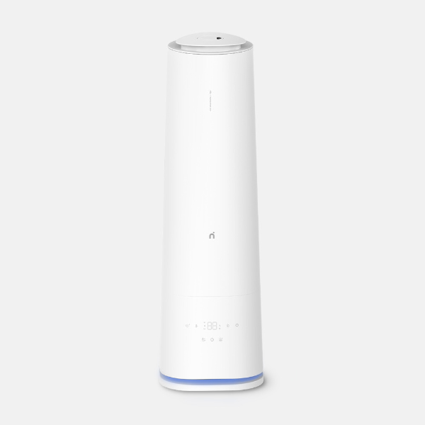 이 가습기는 세련된 원통형 디자인으로, 어떤 인테리어에도 잘 어울립니다. 주로 흰색과 부드러운 파란색이 조화를 이루고 있어 깔끔하고 현대적인 느낌을 줍니다. 또한 가습기의 전면에는 디지털 제어 패널이 있어, 사용자가 쉽게 설정을 조정할 수 있습니다. 또한, 물의 양을 쉽게 확인할 수 있는 투명한 물통이 있어 실용적입니다.