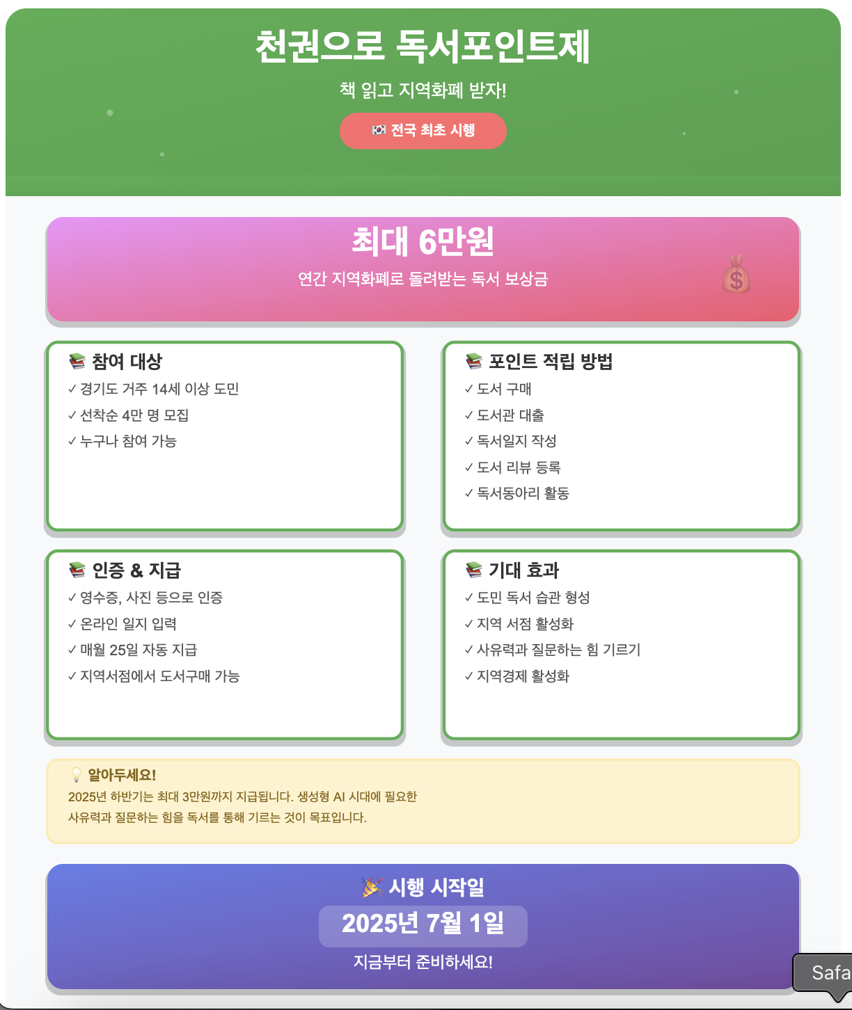 경기도가 전국 최초로 ‘책 읽고 지역화폐 받기’ 제도인 독서포인트제를 2025년 7월 1일부터 시행합니다. 주요 내용은 다음과 같습니다
