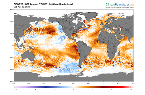 2023년 4월 8일 해수면 온도를 1971년~2000년의 평균 수온과 비교한 사진. 평년보다 수온이 높을수록 빨간색으로 표시된다. (사진 Climate Reanalyzer)/뉴스펭귄 출처 : 뉴스펭귄(https://www.newspenguin.com)