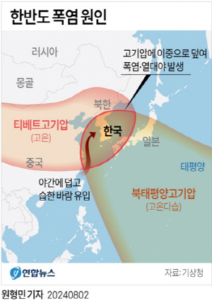 이 고기압들은 북쪽의 찬 공기 유입을 차단하여 한반도 상공에 열이 갇히는 효과를 일으켰고, 낮뿐 아니라 밤에도 기온이 내려가지 않는 열대야가 빈번하게 발생했습니다.