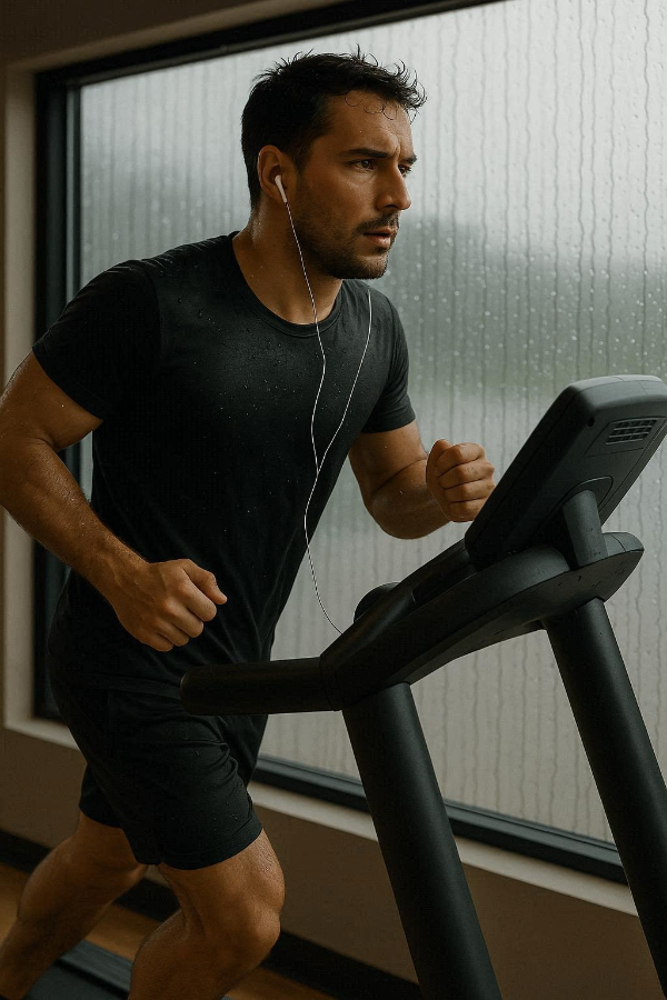 옷을 갈아입었다. 운동복을 꺼내 입고, 운동화 끈을 묶었다. 한 발 한 발, 체육관을 향해 걸었다. 빗속을 걸으며 생각했다. '괜찮아. 조금만 하고 오면 돼. 5분만 뛰면 돼.' 체육관에 도착했다. 근력 운동을 시작했다. 처음엔 몸이 말을 듣지 않는 것 같았다. 하지만 조금씩 움직이다 보니 몸이 풀리기 시작했다. 그리고 런닝머신에 올랐다.
