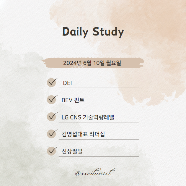 [DS:Daily Study] 2024년 6월 10일_리더의 각성 중 DEI, BEV 펀드, LG CNS 평가, 김영섭 대표-, 신상필벌에 대하여