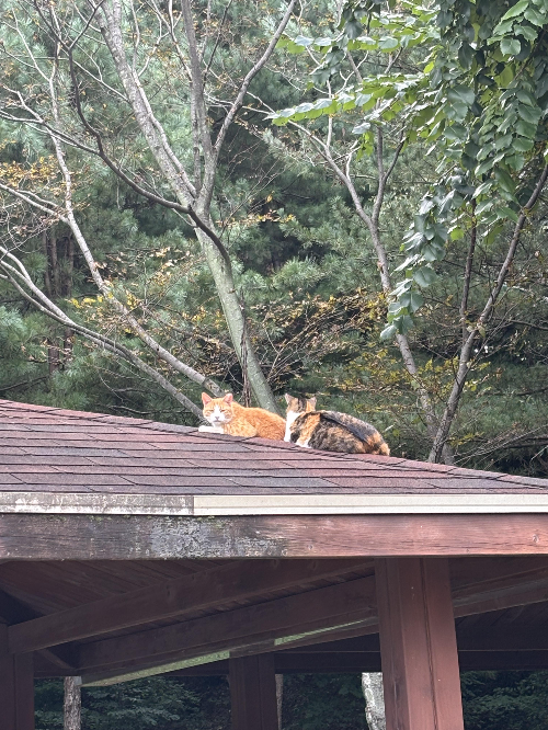공원 정자 지붕에 있는데 저길 어떻게 올라갔나 싶은데